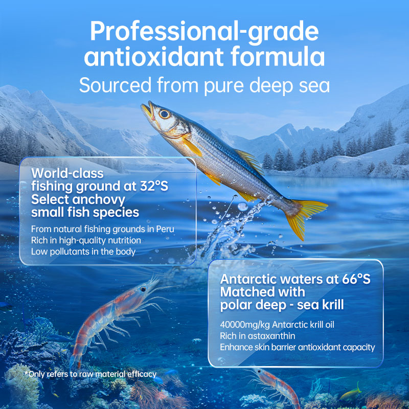 Krill Oil: A potent blend of natural salmon oil and 4000mg/kg Antarctic krill oil, known for its exceptional antioxidant properties and superior absorption, boosting skin health and overall vitality.