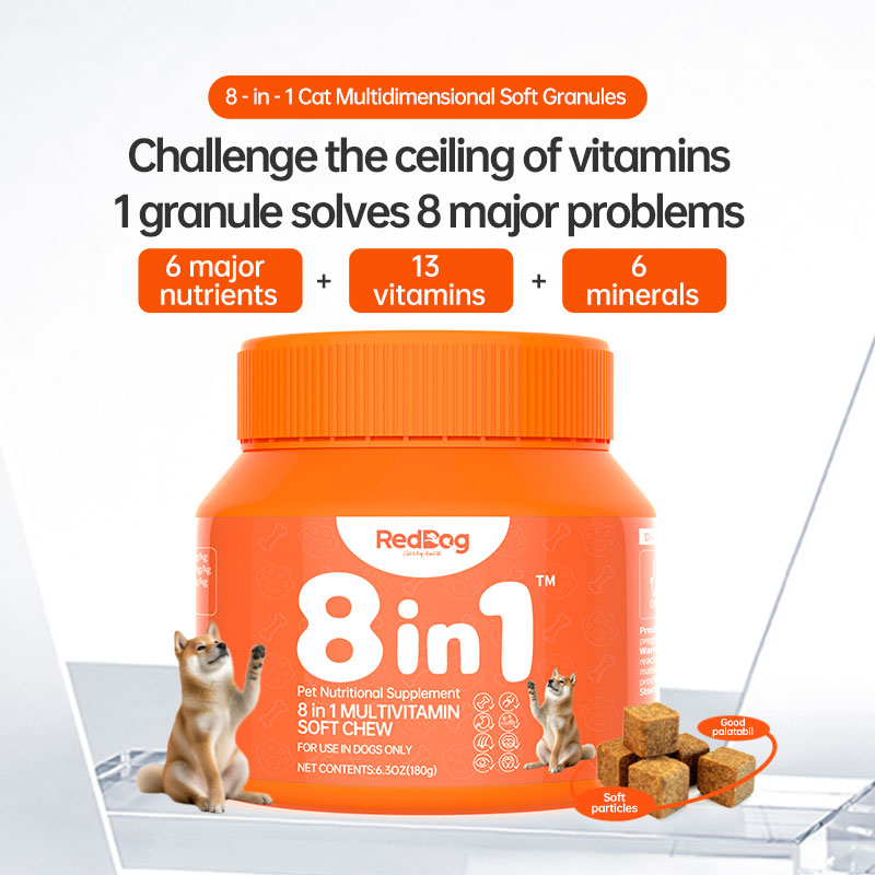 8 in 1 Multivitamin Soft Chew For Dog is a daily nutritional supplement designed to support your dog’s eight essential health needs. Promotes healthy skin and coat, supports eye and brain health, enhances joint mobility, improves oral and urinary tract health, boosts immunity, and aids digestion. Made with high-quality ingredients and palatability-enhancing technology, this formula is perfect for dogs at all life stages.